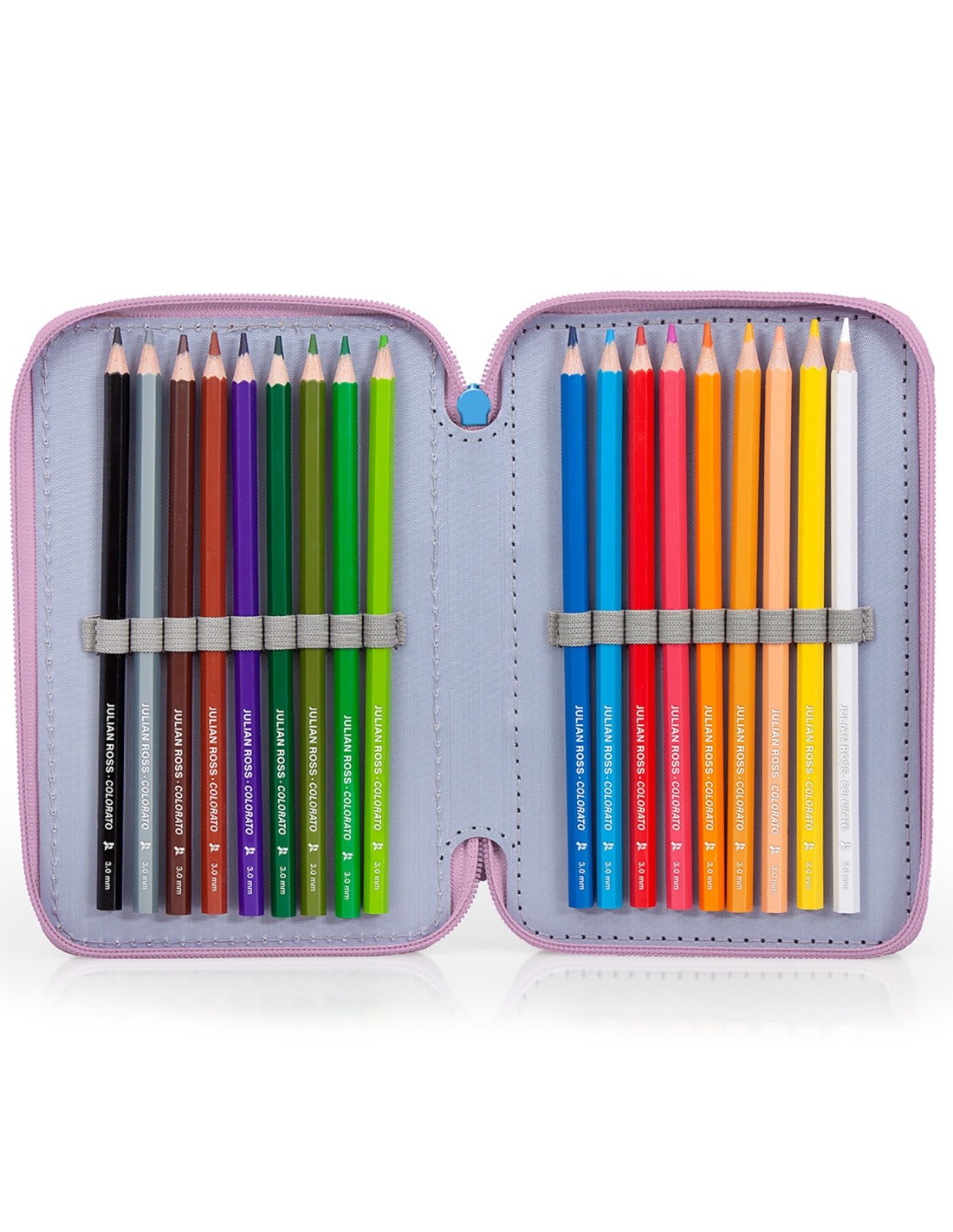 - Contenuto astuccio: triplo scomparto, 1 penna a sfera blu, 1 penna a sfera rossa, 2 matite, 1 gomma, 1 temperino, 1 righello, 1 forbicine, 1 colla stick, 18 pastelli Julian Ross colorato 3.00mm, 18 pennarelli Giotto. Dimensioni: 20 x 12 x 7 cm.