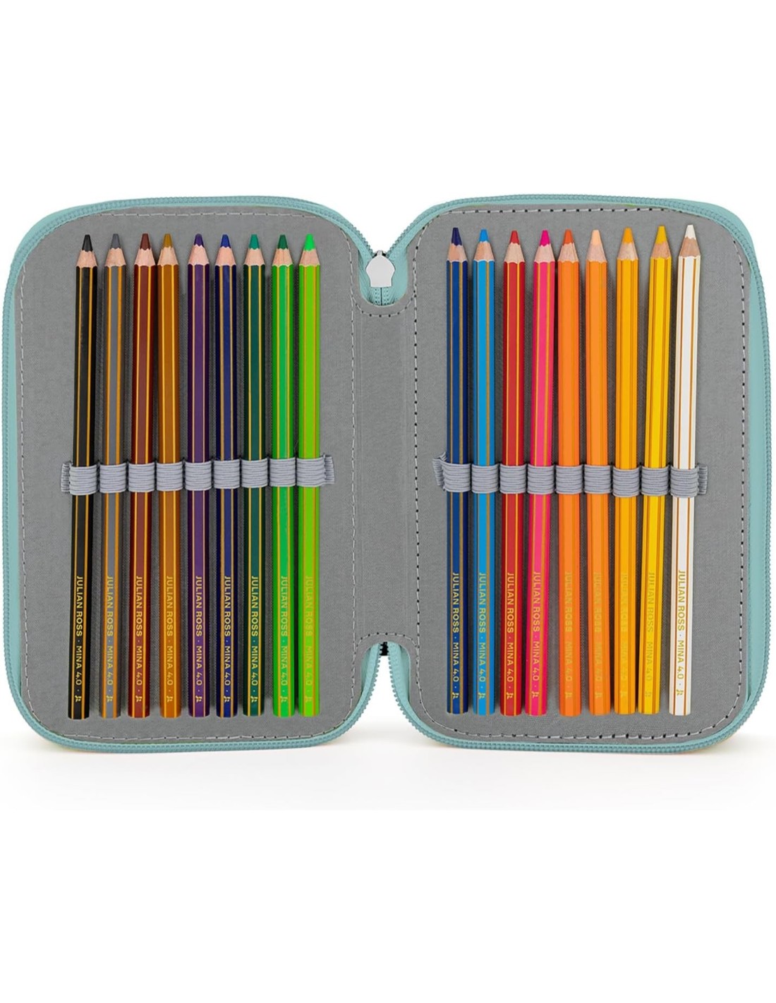 - L'astuccio contiene: triplo scomparto, 1 penna gel cancellabile blu, 1 penna gel cancellabile rossa, 1 matite, 1 pastello rosso/blu, 1 gomma, 1 temperino, 1 righello, 1 forbicine, 1 colla stick, 18 pastelli Julian Ross Mina 4mm, 18 pennarelli Giotto. Dimensioni: 20 x 12 x 7 cm.