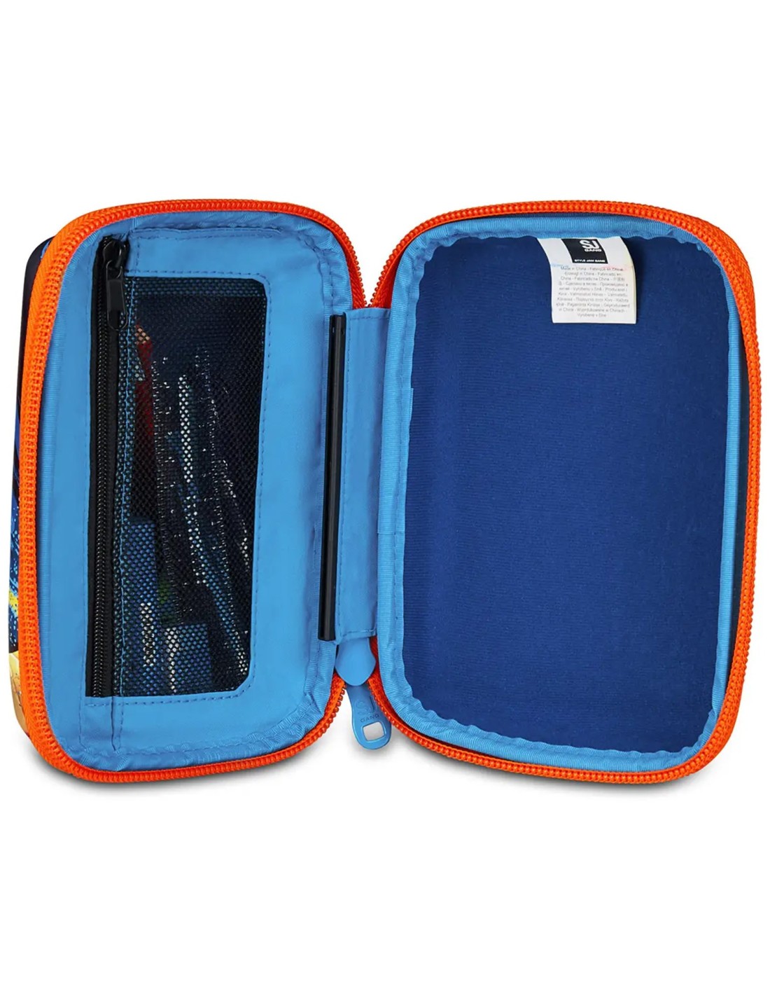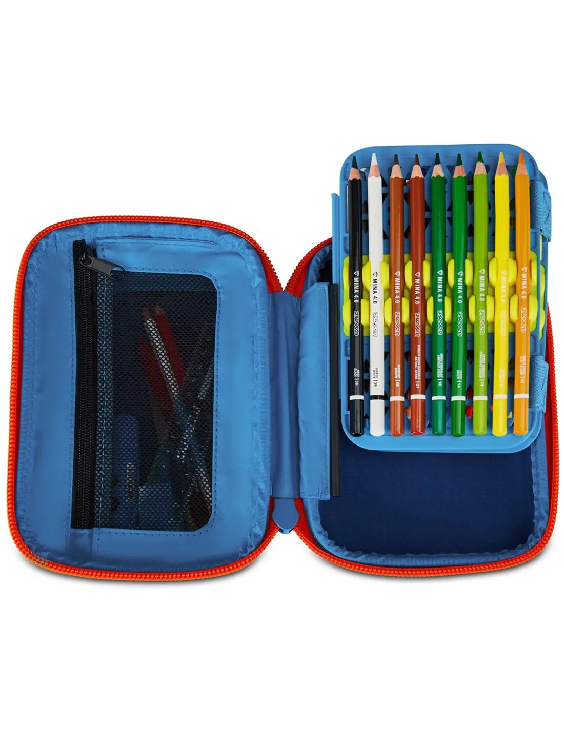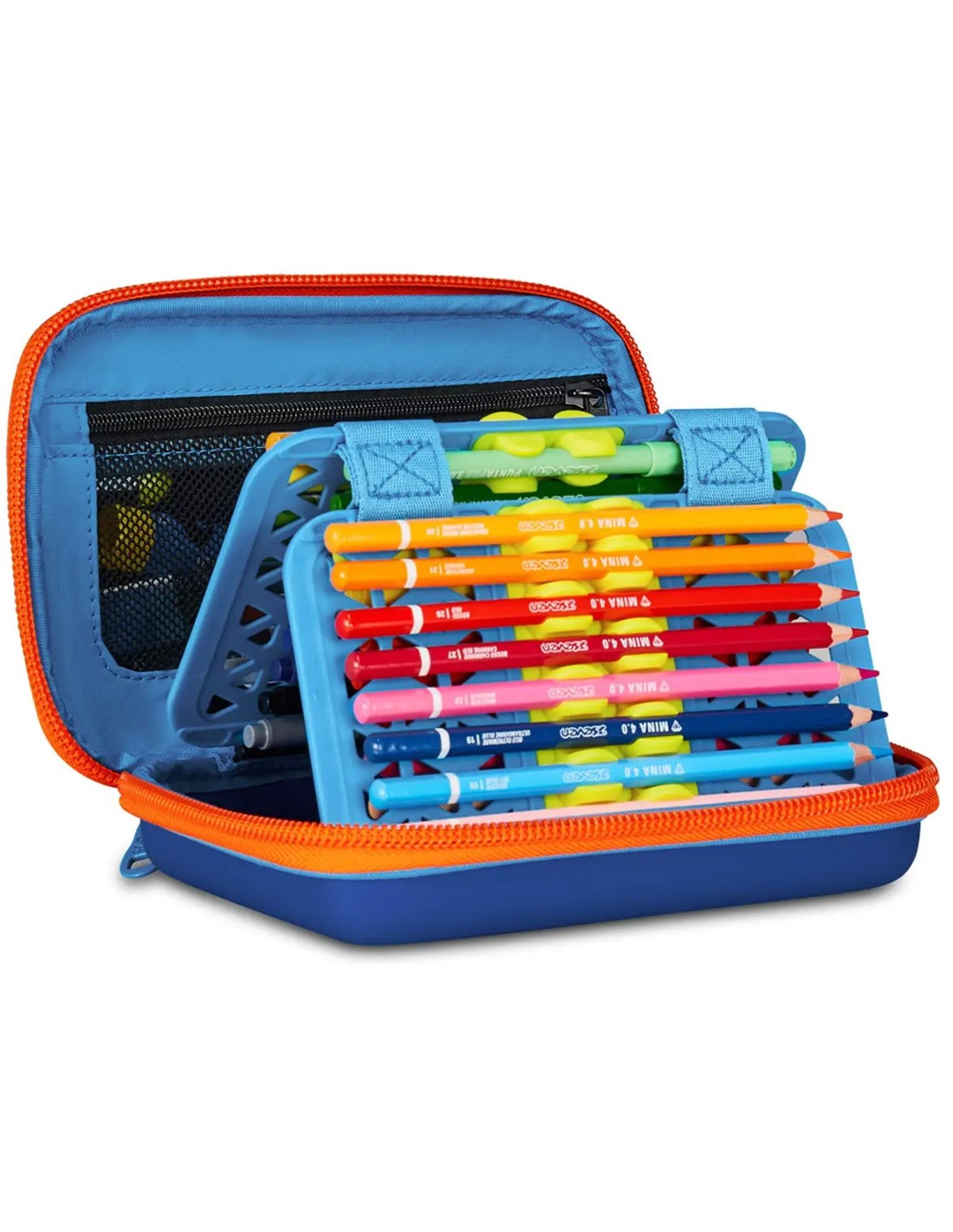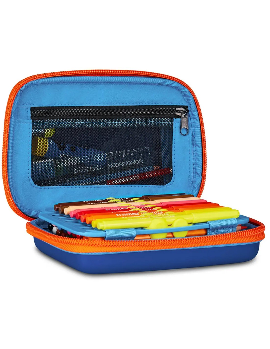 - Altre caratteristiche: Apertura singola tramite maxi zip, plance interne amovibili e agganci flessibili in gomma per cancelleria. CONTENUTO 44 PEZZI: 1 penna cancellabile blu, 1 penna sfera rossa, 18 pastelli a colori 4.0 esagonali, 18 pennarelli superlavabili punta 3.0, 1 matita grafite esagonale HB, 1 colla gialla azzurra, 1 gomma bianca con cartoncino stampato, 1 temperino barilotto 2 fori, 1 righello trasparente azzurro, 1 paio di forbici in metallo con maniglia in plastica