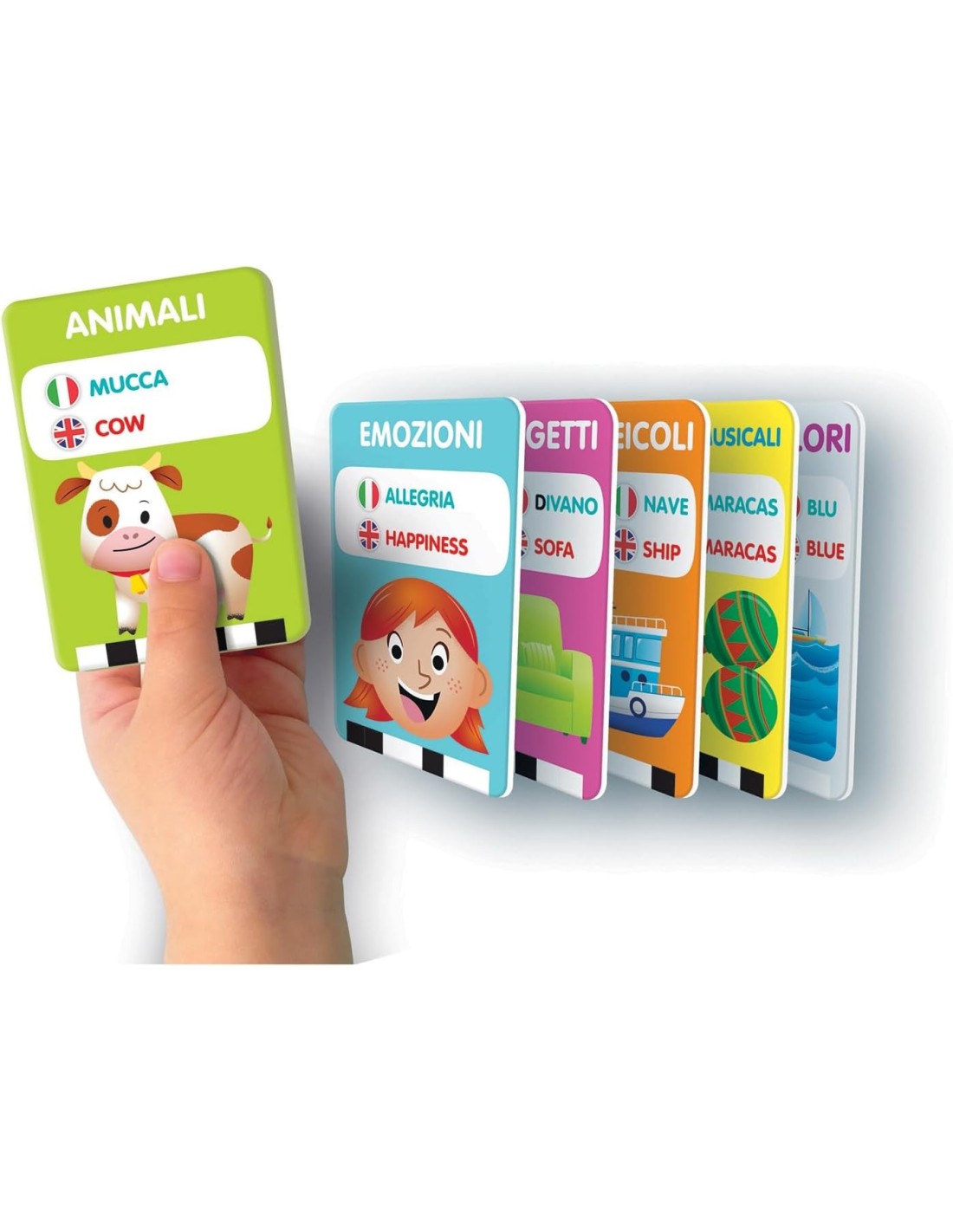 - COSA CONTIENE: gioco educativo ideato, progettato e sviluppato in Italia, adatto per bambini dai 2 ai 4 anni, include 50 flashcards fronte-retro in italiano e inglese e una console interattiva; batterie incluse per un gioco immediato e senza interruzioni
