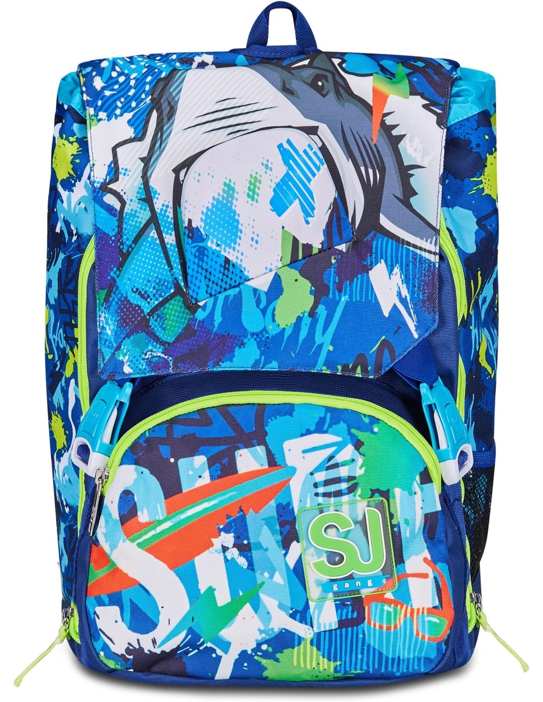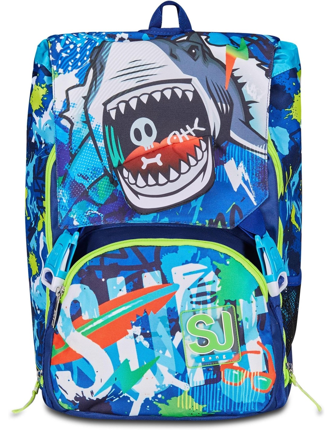 Ciao! Sono SHARKSTORY, lo zaino estensibile SJ GANG con cui vai a scuola e con cui puoi giocare aprendo e chiudendo la mia BOCCA DA SQUALO! Ho un doppio scomparto spazioso, di cui puoi aumentare facilmente la capienza tramite le zip laterali per poter accogliere e distribuire in modo ottimale libri, quaderni e tutto ciò che ti serve per la tua giornata, potendo sfruttare anche la tasca frontale. Inoltre, sono davvero comodo da indossare sulle spalle, grazie a schienale e spallacci confortevoli. In più, il fondo integrato mantiene la mia struttura inalterata, garantendo la stabilità del contenuto anche a pieno carico.